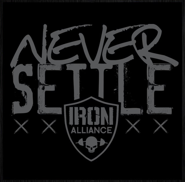 Who doesn't love a black on black shirt?! And it's our first! Front has Never Settle design with the reverse Iron Alliance logo. Back says No Fear, No Limits, No Excuses with the classic IA skull. All in a deep grey print. Printed on an Adult unisex light-weight black tee. Classic semi-fitted - 60% combed cotton, 40% polyester for an ultra-soft comfortable feel. This is the same premium shirts as the Work Fucking Harder tees were printed on (a slight upgrade from the original ones).
